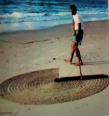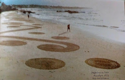 Escrevi na ocasião este texto que reproduzo aqui: “O mar está manso, recua, levado pela baixa maré, deixando para trás um lençol branco de areia. Um espaço natural e ideal para Baldomiro, artista baiano, natural do município de Santo Estêvão, vizinho a Feira de Santana, criar e estampar na areia suas formas geométricas gigantes. São obras efêmeras que desaparecem seis horas depois com a chegada da maré alta. Resta antes documentar a intervenção através de fotografia ou de vídeo, mas, o que interessa mesmo a Baldomiro é interagir com os banhistas ou com as pessoas que fazem caminhadas na areia.