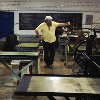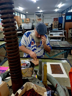 Fui encontrar o professor e artista gráfico Evandro Sybine no velho galpão da Escola de Belas Artes, da Universidade Federal da Bahia, no bairro do Canela, em Salvador, local onde ministra suas aulas ensinando as várias técnicas da gravura aos seus alunos. É um entusiasta desta forma de expressão artística e um colecionador de prensas antigas que as adquire de gráficos, que não mais exercem esta profissão, e até resgata em ferros-velhos antes que virem sucata para siderúrgicas. Tem mais de uma dezena delas, a grande maioria funcionando, e cada uma “batizada” com um nome carinhoso. Considero importante ver um professor entusiasmado com o seu ofício e que repassa o que sabe para os alunos com a garra de um principiante. Ele é bacharel em Artes Plásticas e mestre em Artes Visuais através o programa de pós-graduação também da Escola de Belas Artes-EBA. Foi bolsista da Capes quando desenvolveu pesquisa em Poéticas Visuais e Processos de Criação. Trabalhou como professor substituto na EBA-UFBA no Departamento de Expressão Gráfica e Tridimensional durante um ano de 2006 a 2007 e também como professor do Curso de Gravura em Metal e Monotipia nas Oficinas do Museu de Arte Moderna da Bahia nos anos de 2010 a 2014. Atualmente é professor permanente de Gravura da EBA onde repassa para seus alunos na área das Poéticas Visuais contemporâneas as técnicas de artes gráficas, xilogravura, calcografia, litogravura, serigrafia, tipografia e monotipia.