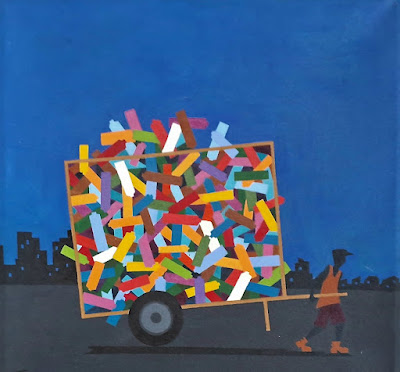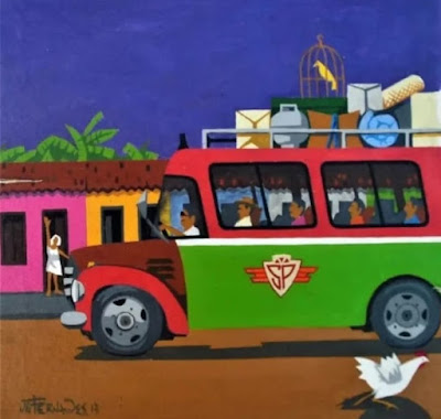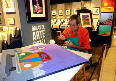 gráficos, como revistas, jornais, livros ou sites. Eles definem a disposição de textos, imagens e design para garantir uma comunicação clara, atraente e funcional, podendo também atuar na pré-impressão”. Evoluiu profissionalmente e tornou-se diretor de arte de várias empresas importantes de publicidade em Salvador, Fortaleza, Curitiba e São Paulo. Antes da internet os diretores de arte mais criativos eram muito disputados e seus passes comprados por quem oferecesse mais vantagens e dinheiro, como acontece hoje com os jogadores de futebol. Diz não se enquadrar” em nenhum estilo,” mas sua pintura tem uma pegada naif e ele trabalha com acrílica sobre tela com um colorido forte, com as tintas quase cruas. Seu processo se inicia com uma base de látex que ele coloca por toda a extensão da tela e quando seca passa a pintar e posteriormente é que estica nos chassis. Não usa o cavalete, e sim uma mesa plana como fazia nos seus tempos de layout man. Para os que não conhecem estilos de pintura naif ” é uma expressão artística de origem francesa , autêntica e popular, criada geralmente por artistas autodidatas que não seguem padrões acadêmicos, perspectiva ou proporções formais. Caracteriza-se por cores vibrantes, temas cotidianos, formas simples e espontaneidade, muitas vezes lembrando desenhos infantis e valorizando a cultura popular.”