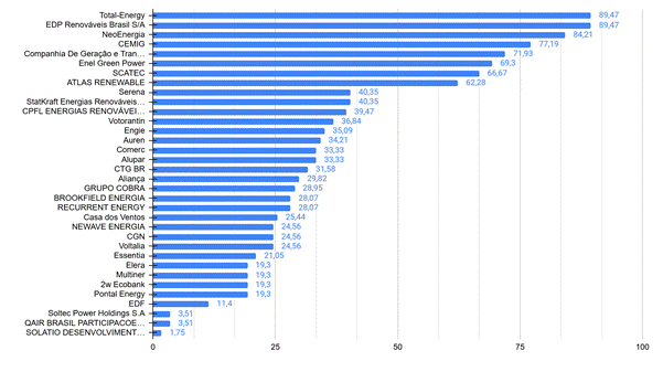 As 34 empresas analisadas foram 2w Ecobank, Aliança, Alupar, Atlas Renewable, Auren, Axia (antes Eletrobras), Brookfield Energia, Casa dos Ventos, CEMIG, CGN, COMERC, CPFL Energias, CTG BR, EDF, EDP Renováveis, Elera, Enel Green Power, Engie, Essentia, Grupo Cobra, Multiner, Neoenergia, Newave Energia, Pontal Energy, Qair Brasil, Recurrent Energy, Scatec, Serena, Solatio, Soltec Power, Statkraft, TotalEnergies, Voltalia Energia e Comerc.