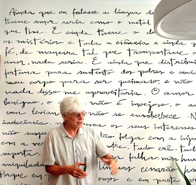 Ele escreveu a mão na parede da sala do seu apartamento, no bairro da Graça, em Salvador, e deu um efeito muito interessante. E a reprodução de parte da primeira Carta aos Corintios escrita pelo apóstolo Paulo em Éfeso, atribuída ao ano de 56, com o objetivo de restabelecer a unidade através o amor e chamando a atenção que o único líder é Cristo. Ruy Carvalho é cristão e congrega a igreja batista . Disse que não prega religião e sim o Evangelho. Nesta carta Paulo fala da importância do amor e “utilizei a arte para pregar o amor em minha moradia e aos que aqui nos visitam”. Dizem os estudiosos da Bíblia que “Corinto era uma rica cidade comercial, com mais de