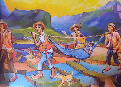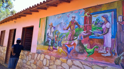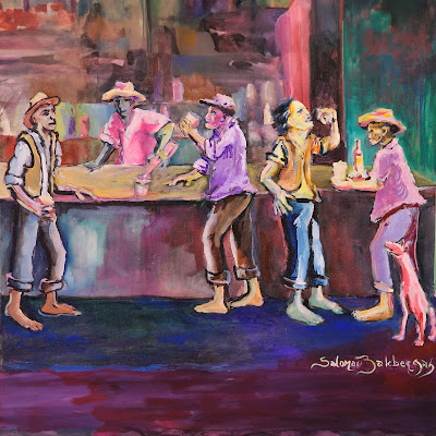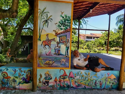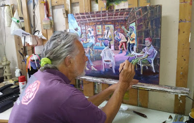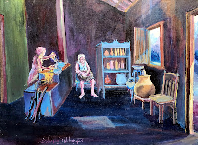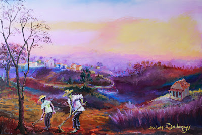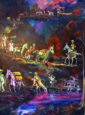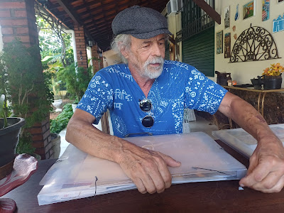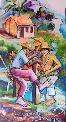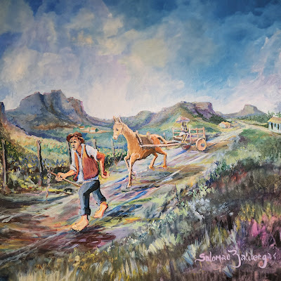 Quando digo que seus traços lembram os Almanaques é bom saber que essas publicações eram disputadas no século XIX quando no início do ano os comerciantes desses rincões do Brasil distribuíam aos seus principais clientes. Além do calendário do ano traziam diversas informações úteis, poesias, trechos literários, anedotas , curiosidades, e sempre com farta ilustração. Essas lembranças da terra onde vive e trabalha o artista paulista mostra as ações do cotidiano bucólico e da vida simples desta gente que vive o seu dia a dia repetindo os mesmos costumes de outrora como cozinhando no fogo de lenha, colocando o feijão que colheram na roça para secar no terreiro, socando o milho num pilão de madeira  para fazer o cuscuz, prosando na frente da casa, tomando uma pinga na bodega. Por ser uma região onde já se garimpou muitos diamantes, quando chove moradores locais pegam as bateias e sobem a serra para garimpar algum diamante, com o sonho de enriquecer. Estes e outros costumes da região da Chapada Diamantina são motivos de inspiração para este filho de lituano com uma paranaense descendente de russos  que vieram morar nas  bandas paulistanas, onde se conheceram e casaram.